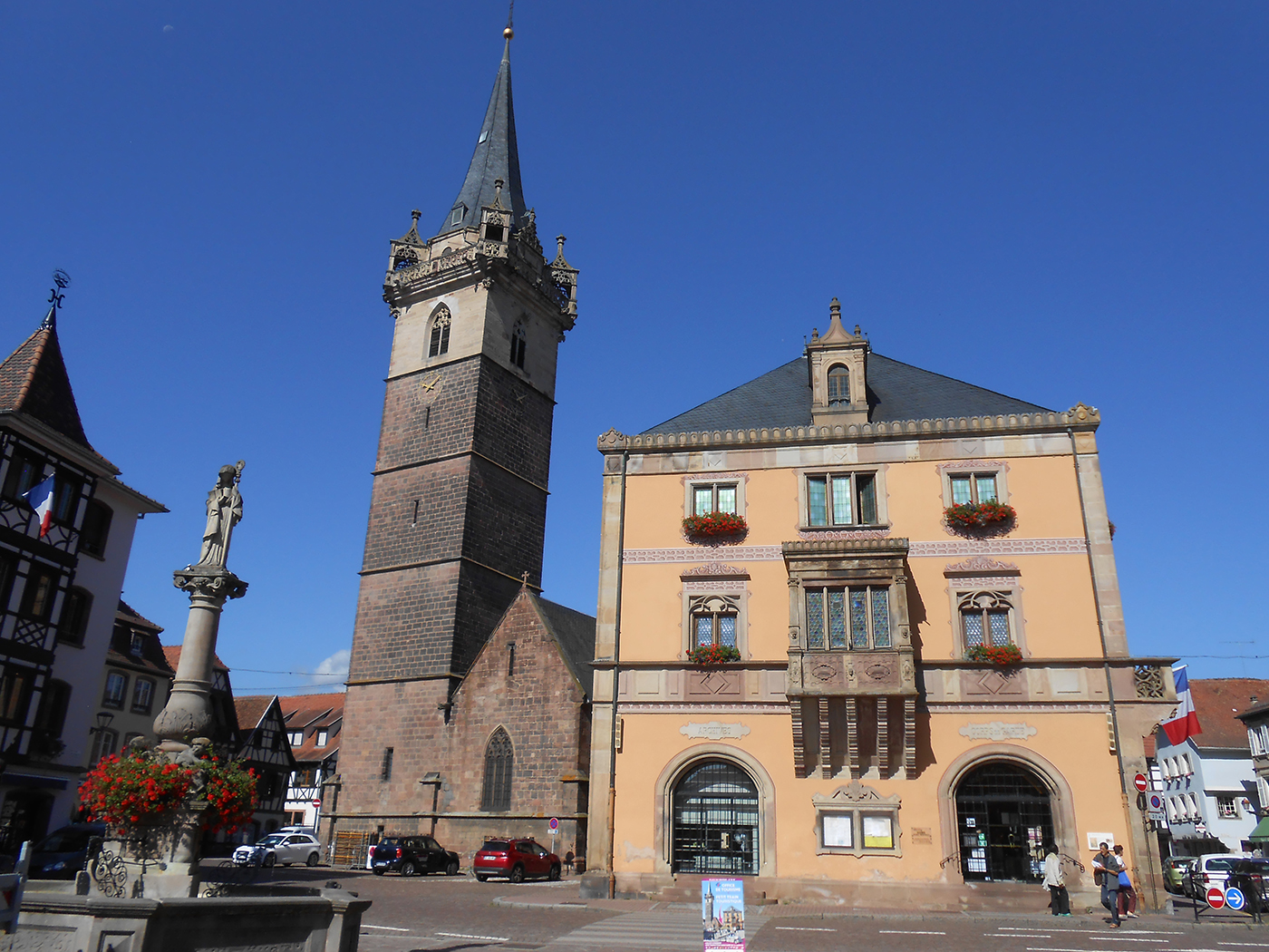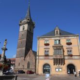 Die Hl.Paul-Kirche hat keine Glocken und auch nie welche gehabt. Das Glockengeläut kommt vom Kappelturm, den sie vom Place du Marché aus erkennen. Seit 1301 befindet sich hier der Wochenmarkt . Eingerahmt wird dieser Platz vom Rathaus mit „Scheinbemalung“, der früheren Kornkammer und in der Ecke der Odilienbrunnen.